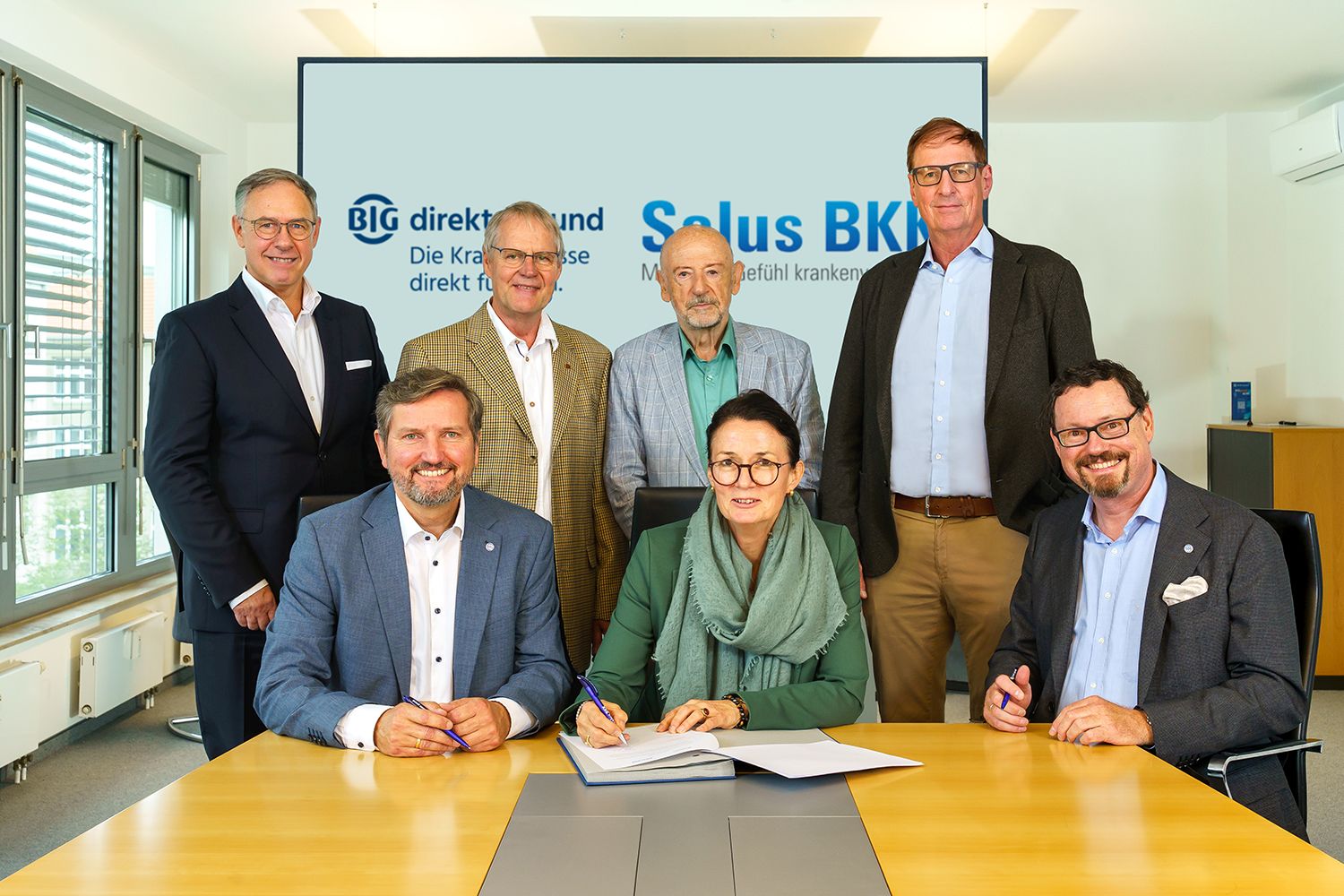 Den Kooperationsvertrag mit dem Ziel einer Fusion zwischen der BIG direkt gesund und der Salus BKK unterzeichneten Ute Schrader, Vorständin der Salus BKK, Peter Kaetsch (vorn links), Vorstandsvorsitzender der BIG direkt gesund, und Markus Bäumer (vorn rechts), stellvertretender Vorstandsvorsitzender der BIG. Den wegweisenden Beschluss hatten zuvor die Verwaltungsräte der beiden Kassen gefasst, vertreten auf dem Foto durch die alternierenden Verwaltungsratsvorsitzenden (oben von links) Robert Leitl und Helmut Krause von der BIG, sowie Uwe Bratje und Albrecht Ehlers von der Salus BKK. |