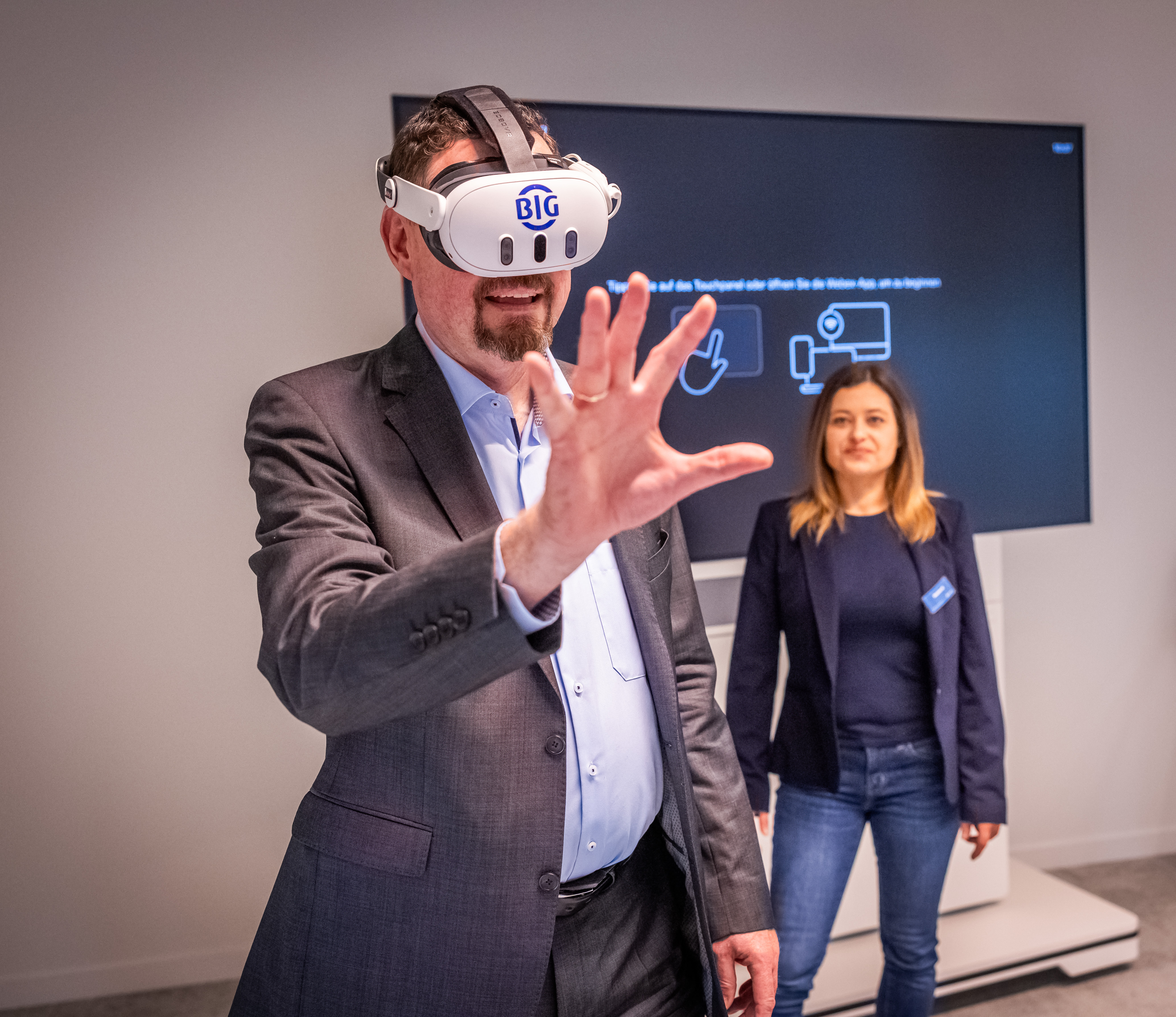 Markus Bäumer, stellvertretender Vorstandvorsitzender der BIG, beamte sich dem neuen Angebot VR Health Resort auf eine tropische Insel. Im Hintergrund Irene Barleben von dem Dortmunder VR-Spezialisten viality.
